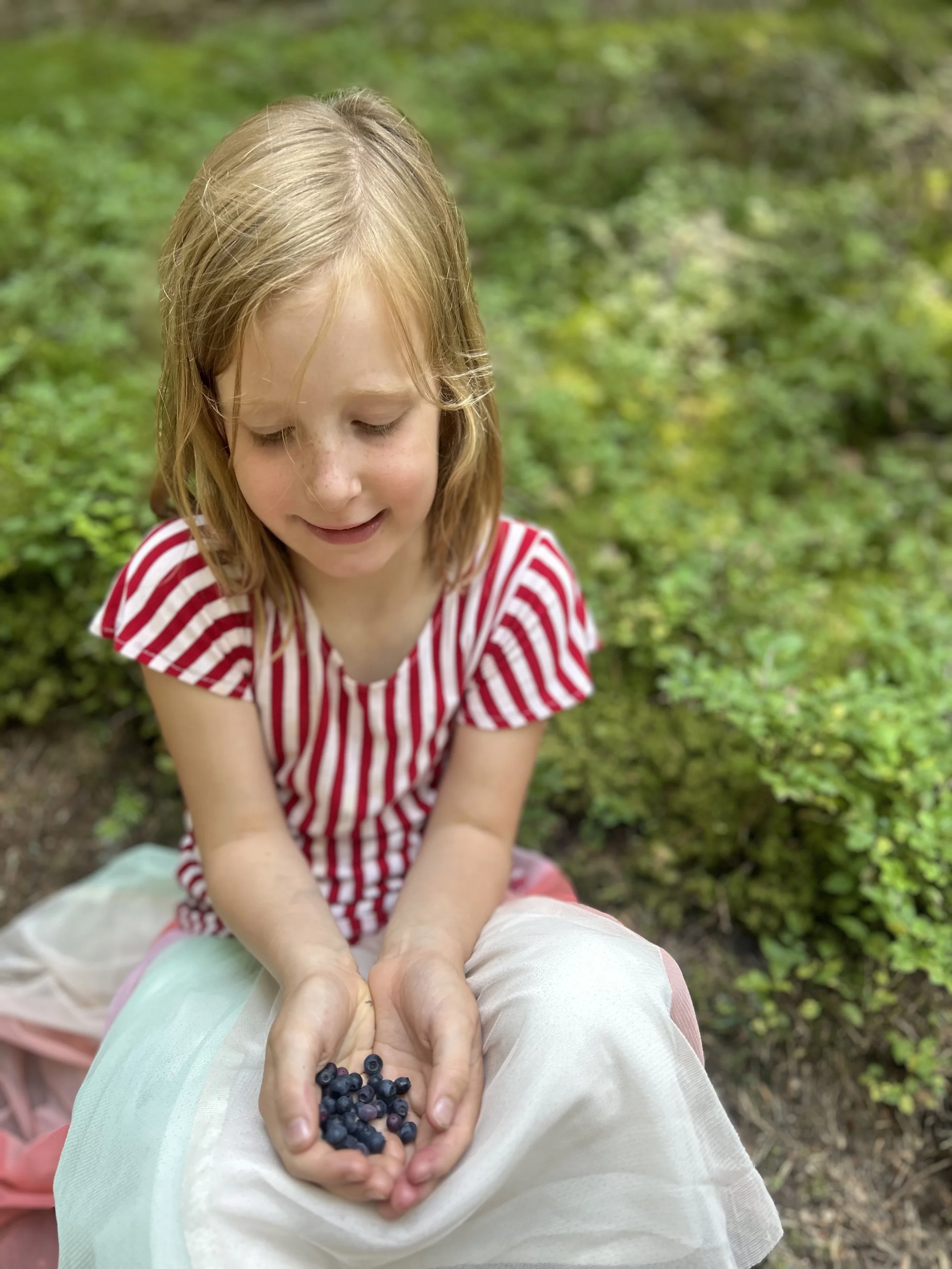 Oogsten . Knap meisje met blond haar in gestreept shirt houdt bosbessen vast in de handen.